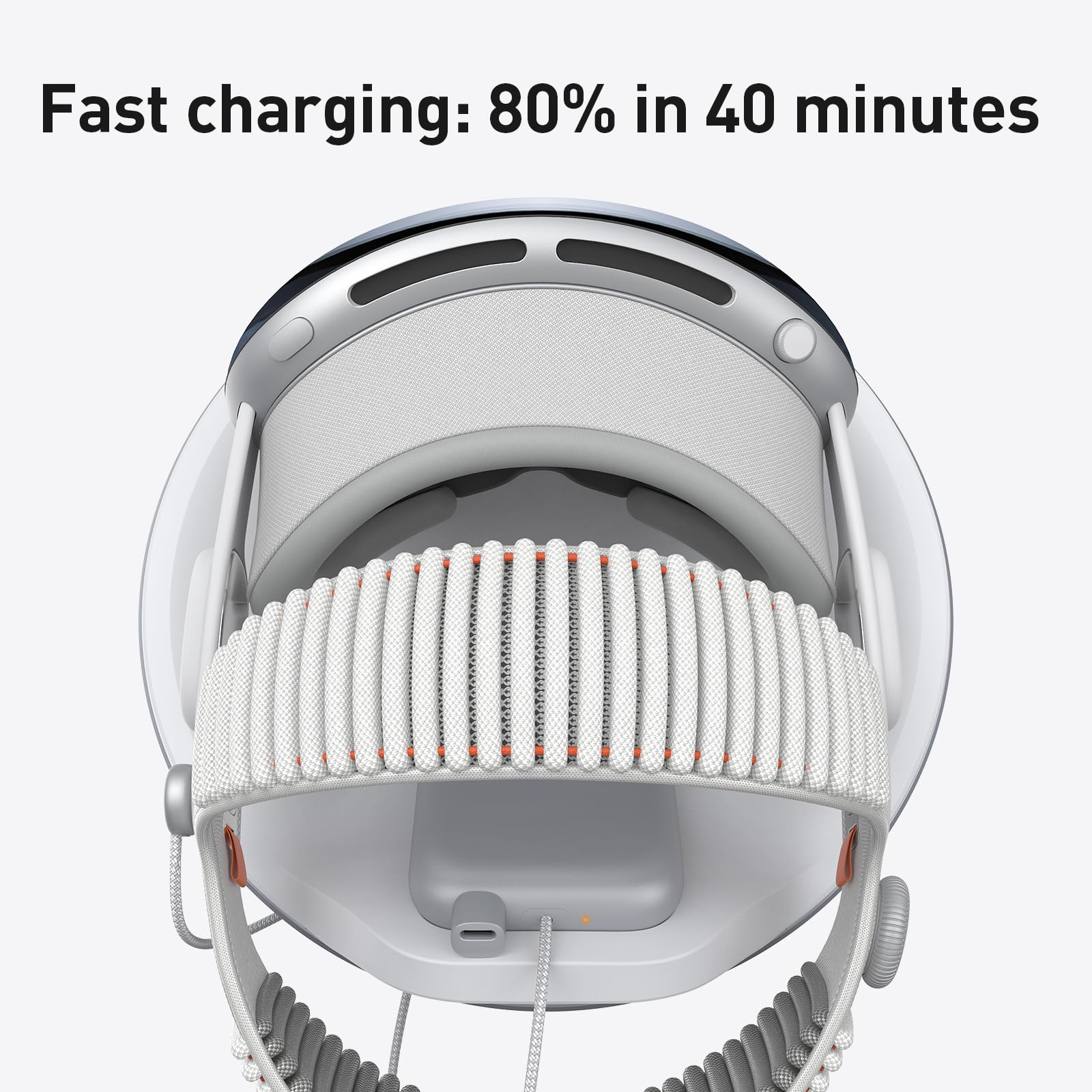 - Q: How fast can the PRISMXR Charging Dock charge my Vision Pro battery? A: The dock supports ultra-fast charging at sixty-five watts, allowing you to charge your Vision Pro battery to eighty percent in approximately forty minutes.