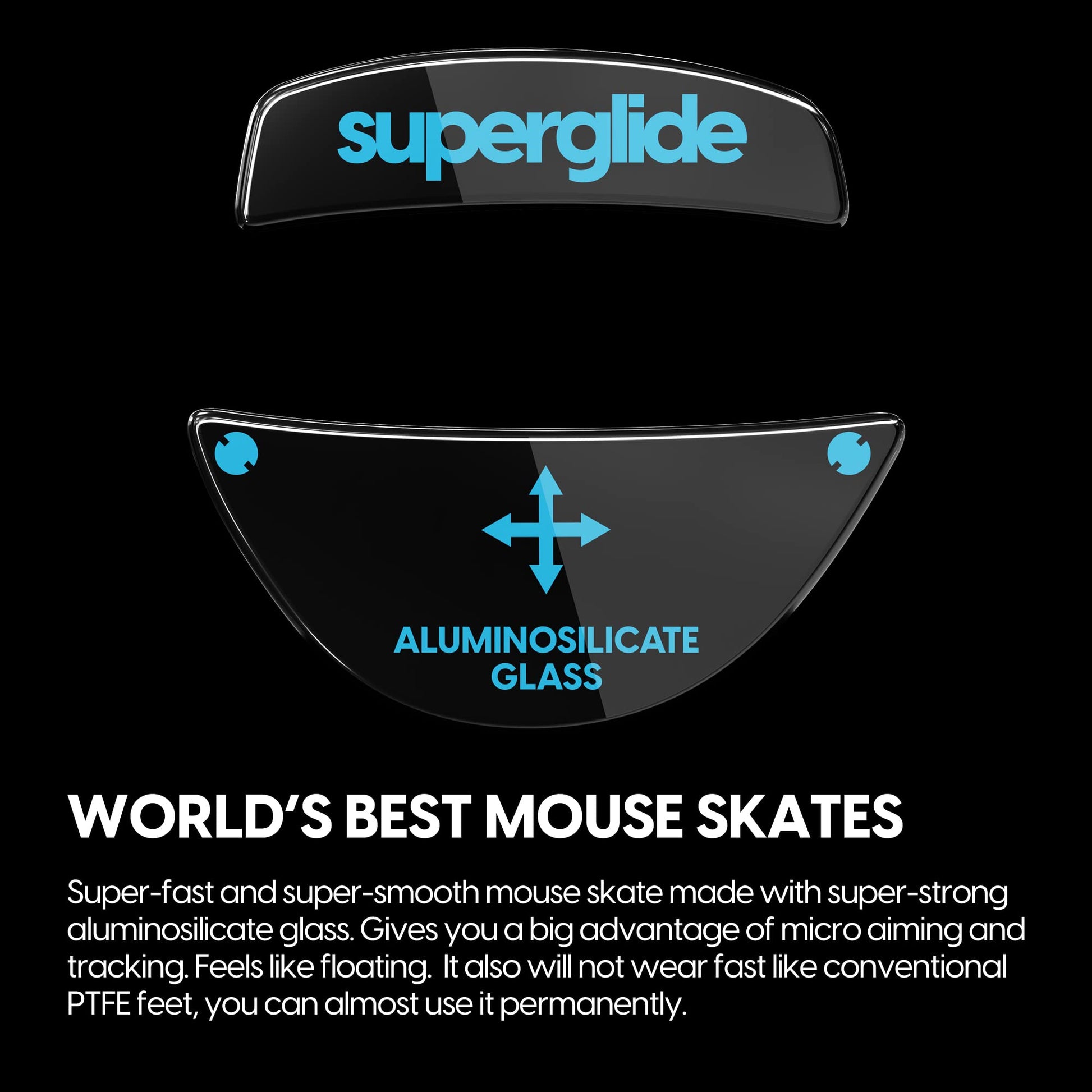 - Q: What are the main features of the Superglide mouse feet? A: The Superglide mouse feet are made with aluminosilicate glass, providing super fast and smooth gliding. They feature a flawlessly polished round edge for a seamless glide, are built for durability with tempered glass that resists wear, and are designed for eSports grade accuracy.
