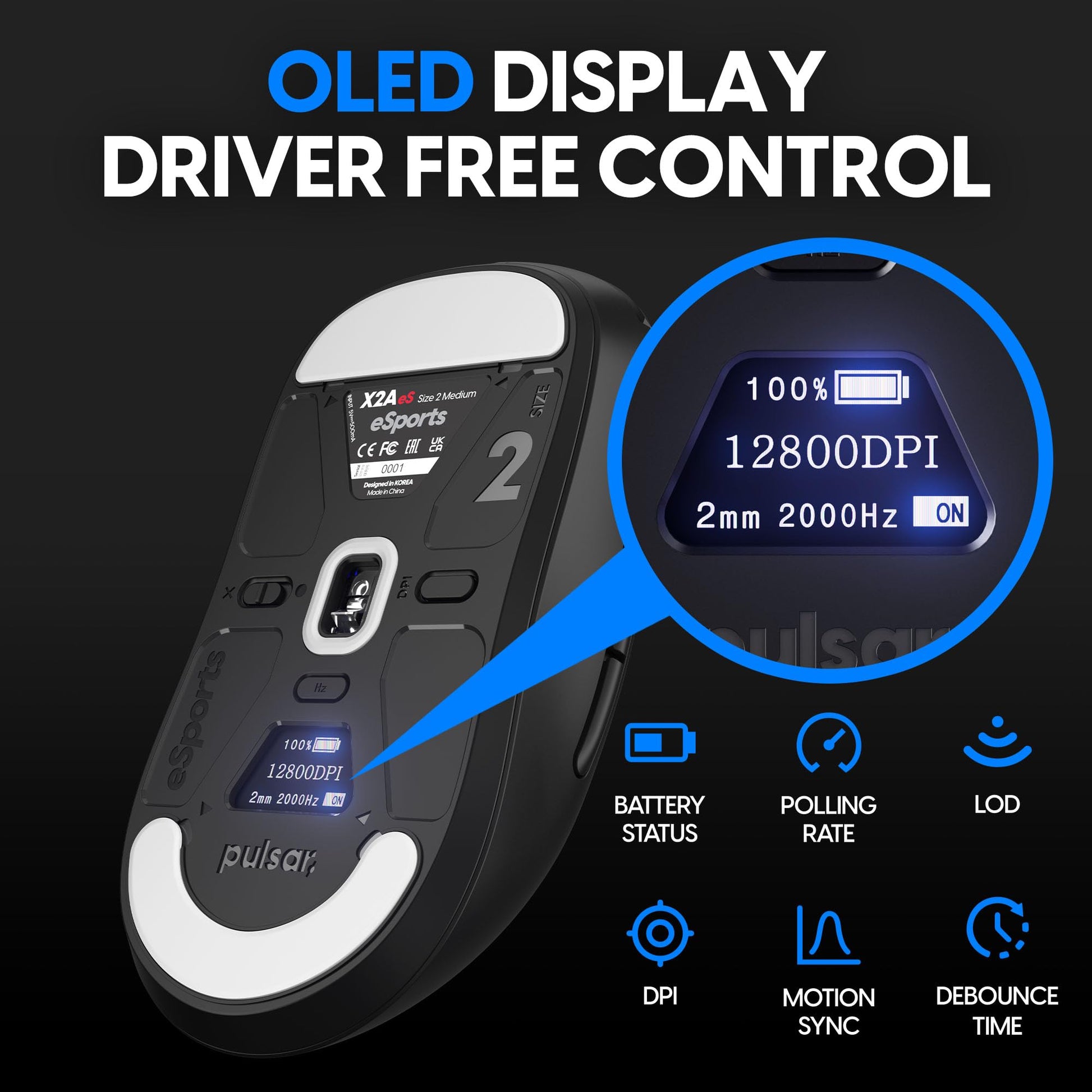 - Q: How does the OLED display benefit users of the X2A eS Wireless Gaming Mouse? A: The OLED display allows users to easily monitor battery levels and adjust key settings such as DPI, motion sync, and debounce time, enhancing user control and convenience.