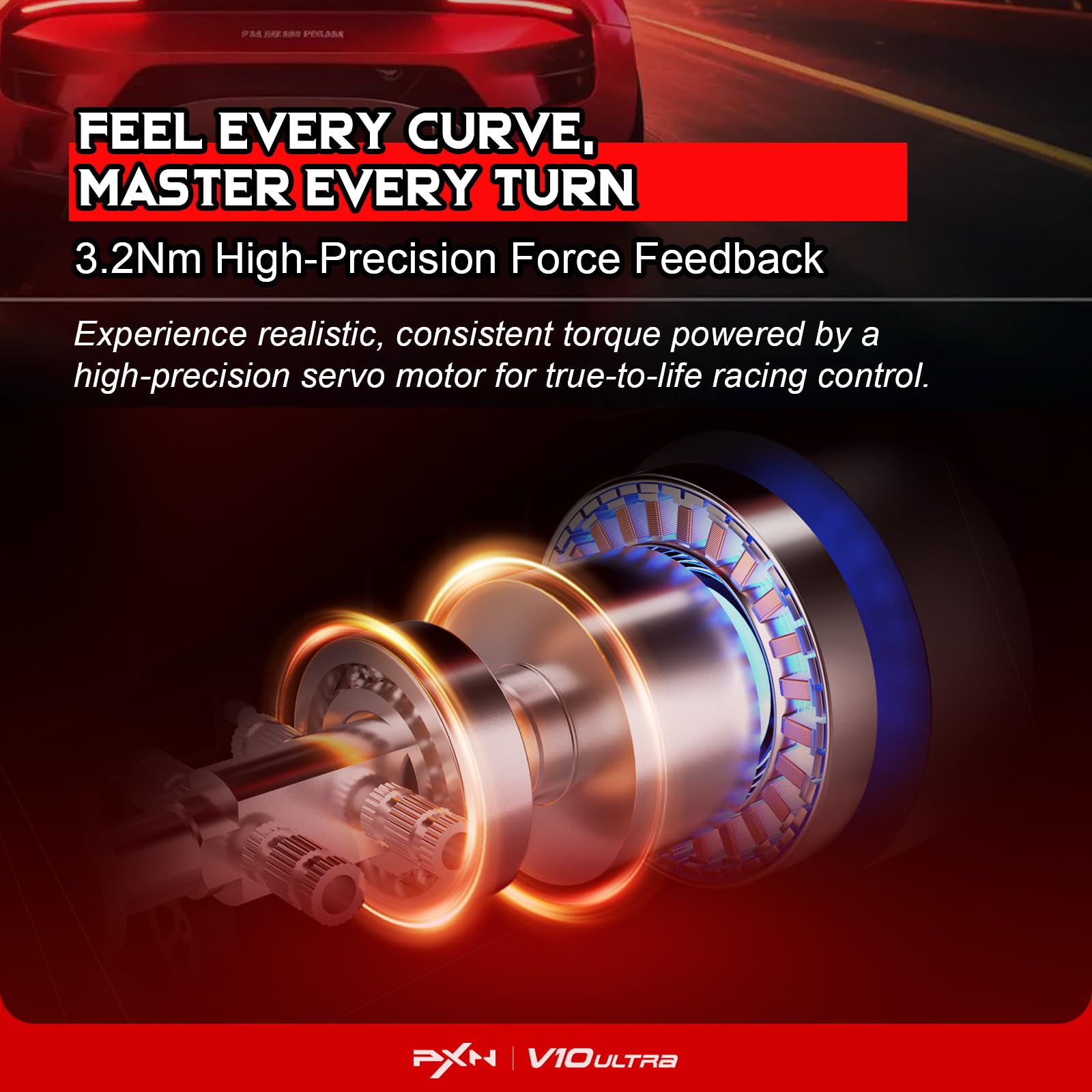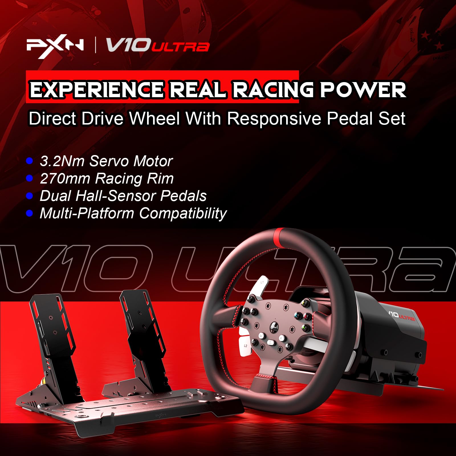 PXN V10 Ultra Gaming Steering Wheel & Pedals, 3.2Nm Force Feedback, 10.6-inch Rim, Black, Compatible with Xbox, PS4, and PC