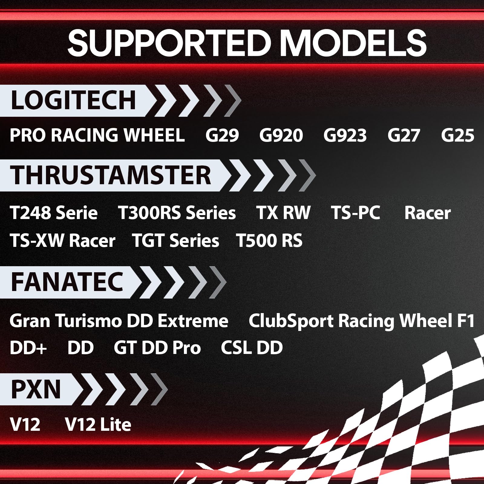 - Q: What racing wheels are compatible with the RACGTING Racing Simulator Cockpit? A: The RACGTING Racing Simulator Cockpit is compatible with a variety of racing wheels including Logitech models (G PRO, G29, G920, G923), Thrustmaster models (T248, T300RS, T-GT, TS-PC, TS-XW Racer), and Fanatec models (CSL DD, GT DD Pro, ClubSport DD, DD+). For additional compatibility inquiries, you can contact customer support.