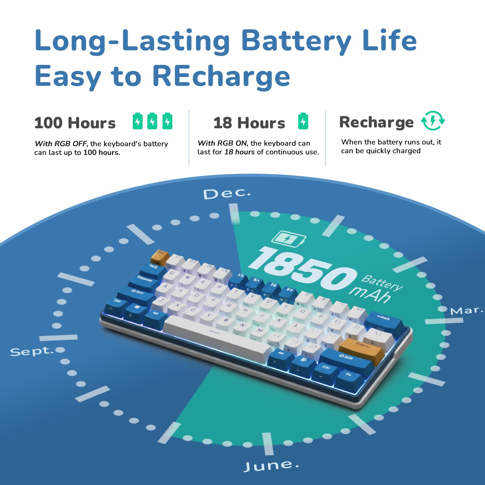 - Q: What is the battery life of the RK ROYAL KLUDGE RK61 Plus? A: The keyboard is equipped with an eighteen hundred fifty milliampere-hour rechargeable battery, providing long standby time for extended use during work or gaming sessions.