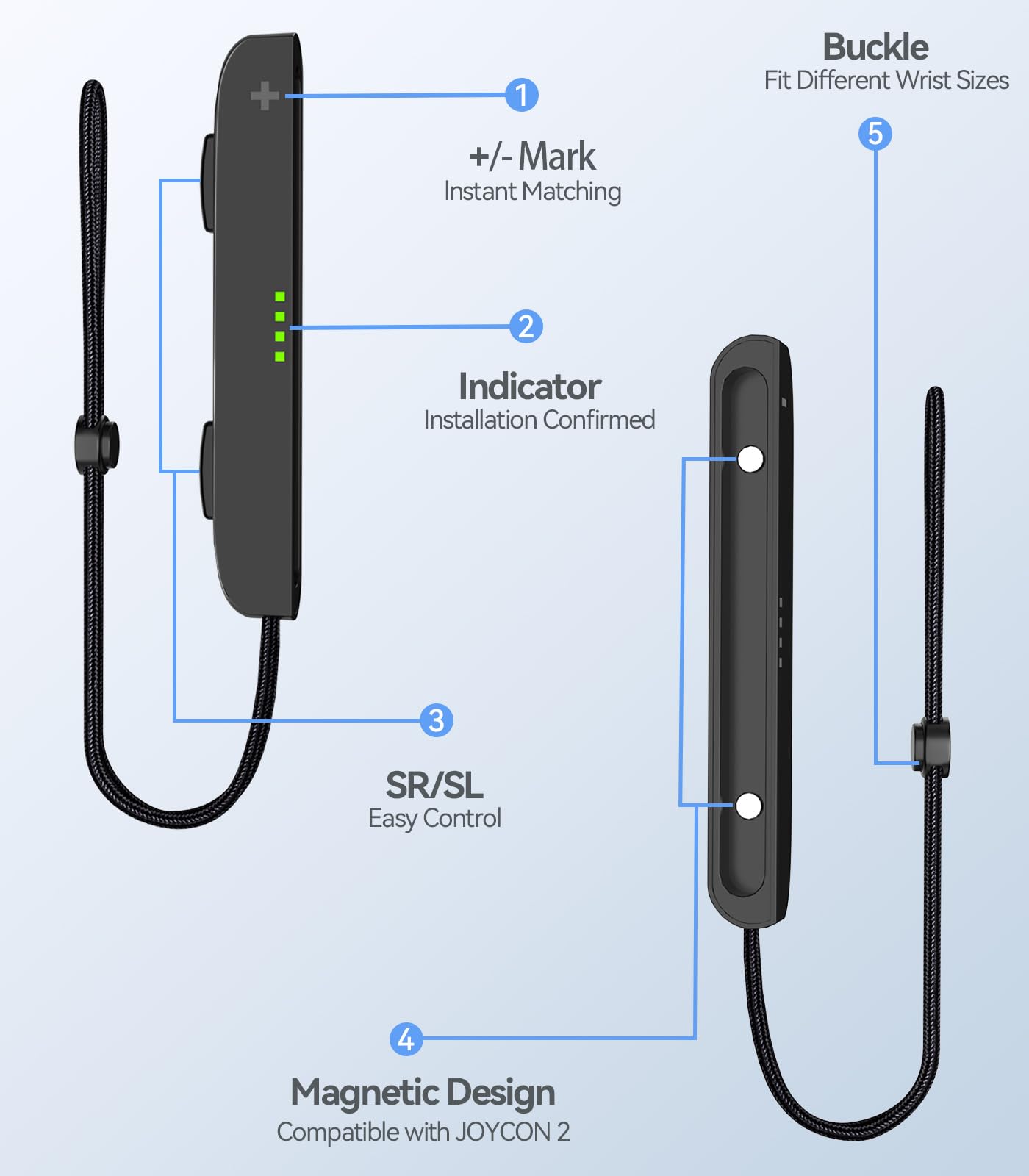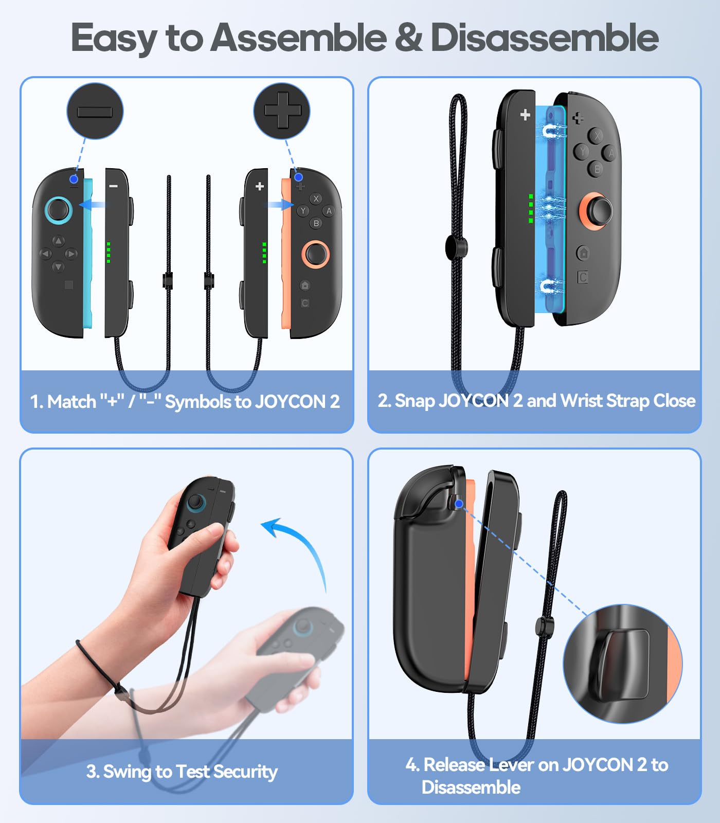 - Q: How do I attach and detach the Rysker Wrist Straps to my Joycon 2 controllers? A: To attach the straps, align the '+' and '-' marks on the wrist strap and the Joycon 2, and then let them snap together magnetically. To detach, simply flip the latch on the back of the Joycon 2.