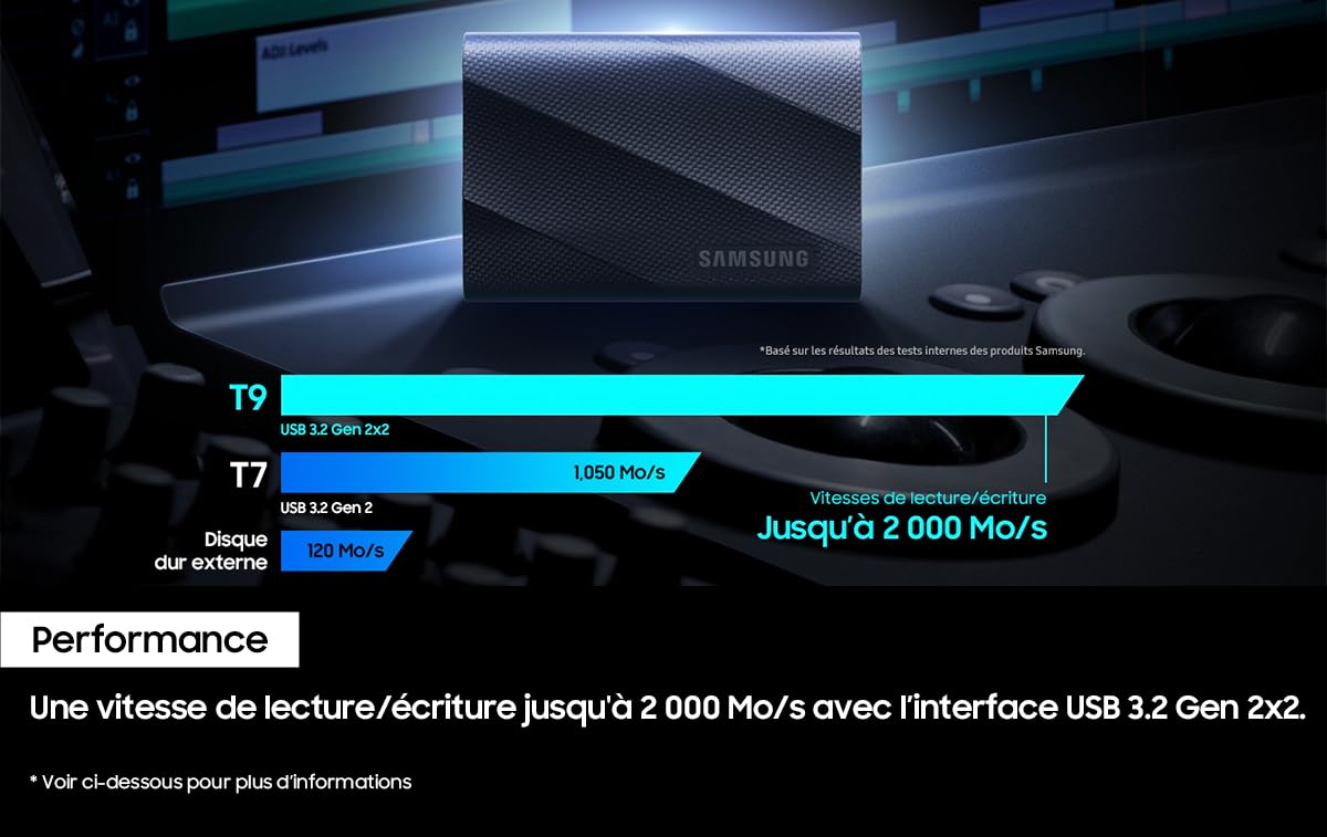 - Q: What is the maximum data transfer speed of the Samsung T9 Portable SSD? A: The Samsung T9 Portable SSD offers a maximum data transfer speed of up to two thousand megabytes per second, utilizing NVMe technology and USB 3.2 Gen 2x2.
