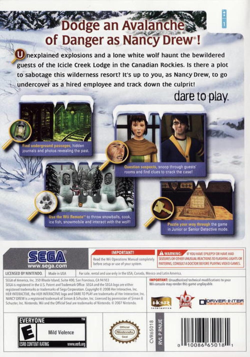 - Q: Where can I find more information or support for Nancy Drew: The White Wolf of Icicle Creek? A: For more information or support, you can visit the official Sega website or consult gaming forums and communities that discuss Nancy Drew games.