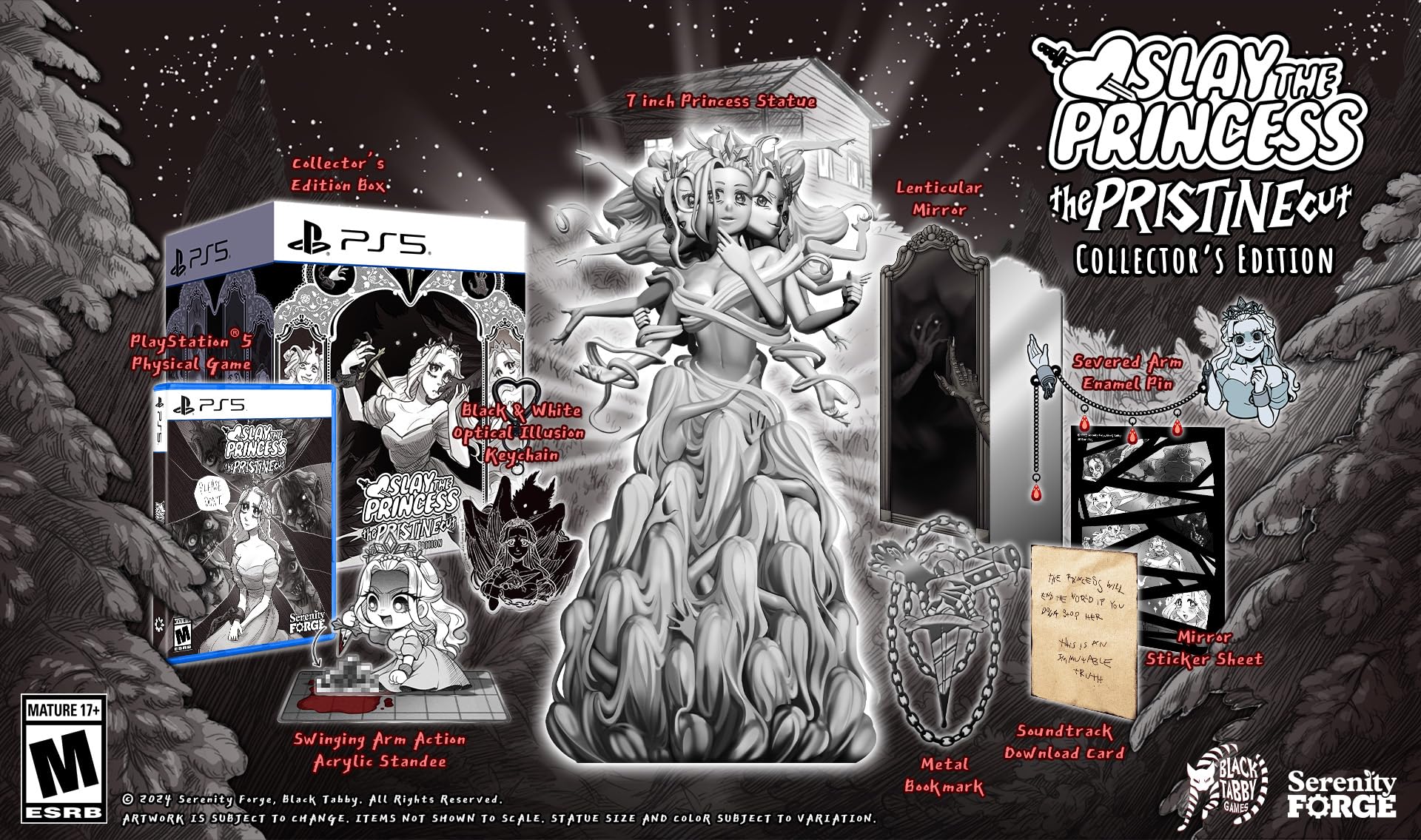 - Q: What is included in the Collector's Edition of 'Slay the Princess'? A: The Collector's Edition includes a physical game, a metal bookmark, a severed arm enamel pin, interior case art, a black and white optical illusion keychain, a swinging arm action acrylic standee, a seven inch princess statue, a collector's edition box, a soundtrack download card, and a mirror sticker sheet.