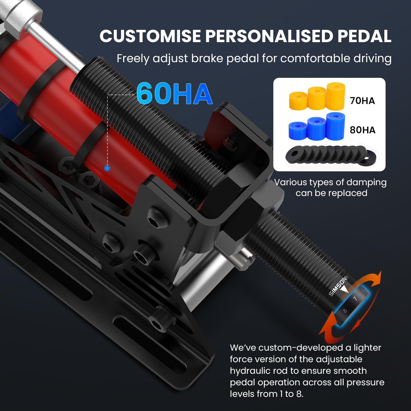 - Q: What kind of damping system does the brake pedal use? A: The brake pedal includes an adjustable hydraulic resistance rod with eight levels of adjustment. Additionally, it features damping made from sixty HA red rubber, with options for replacing it with eighty HA or ninety HA dampers.