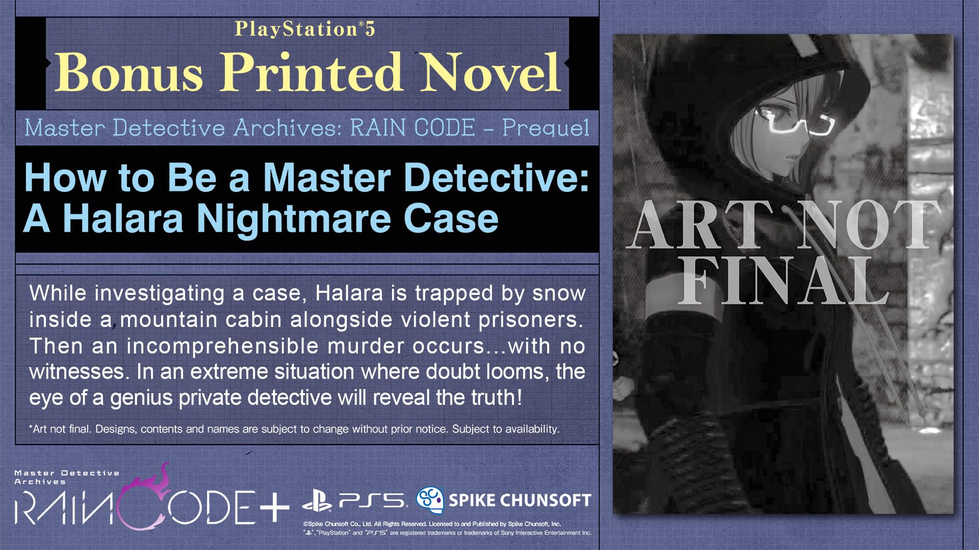 - Q: Are there any special editions of Master Detective Archives: RAIN CODE? A: The Standard Edition of Master Detective Archives: RAIN CODE includes an original printed novel titled 'How to Be a Master Detective: A Halara Nightmare Case' packed inside each game case, adding value to the purchase.