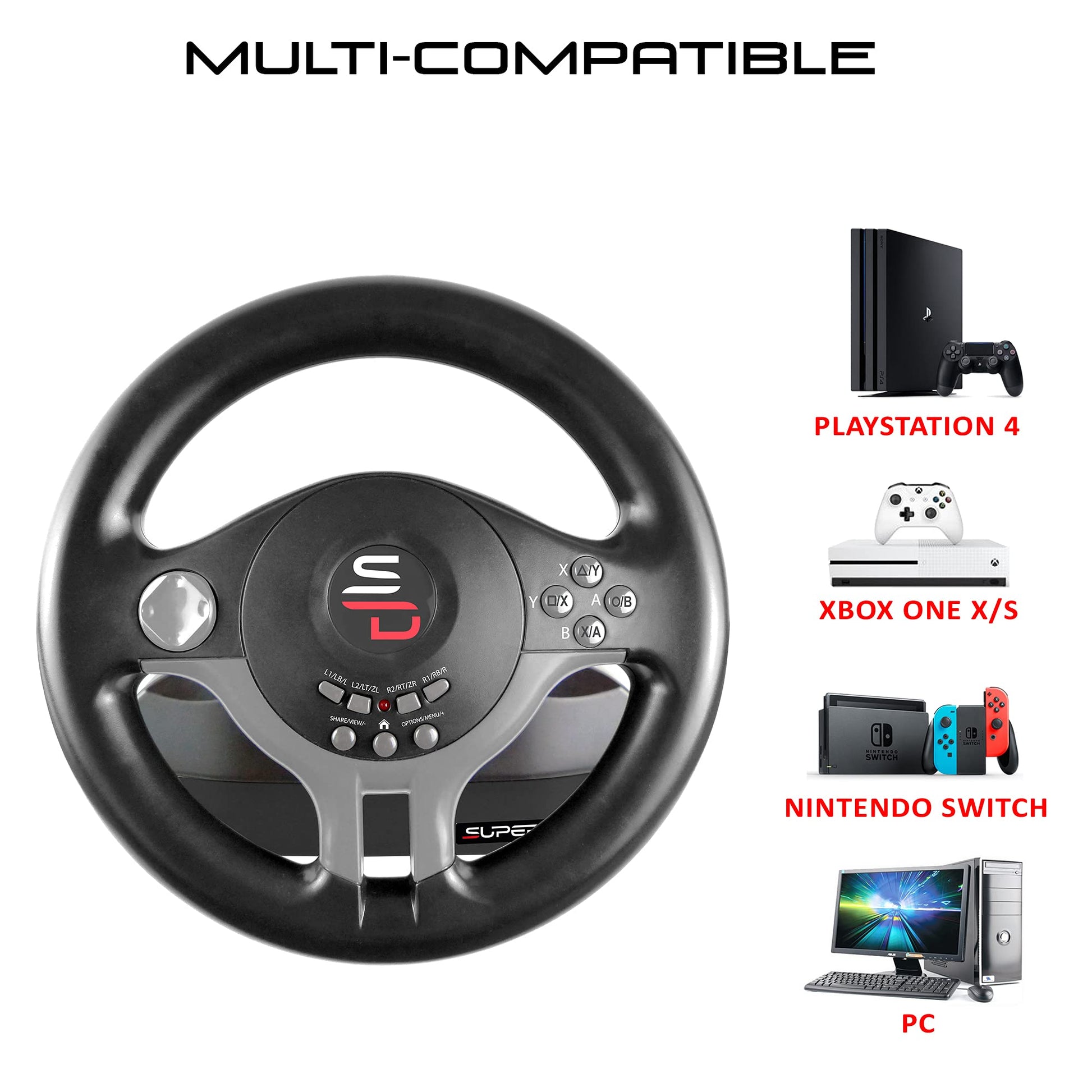 The SUBSONIC Superdrive SV250 is a versatile and multi-platform compatible steering wheel designed for gamers who seek an immersive driving experience across various gaming consoles and PC. Ideal for racing enthusiasts, it enhances gameplay on systems like the Nintendo Switch, PS4, Xbox Series X/S, Xbox One, PC, and PS3.