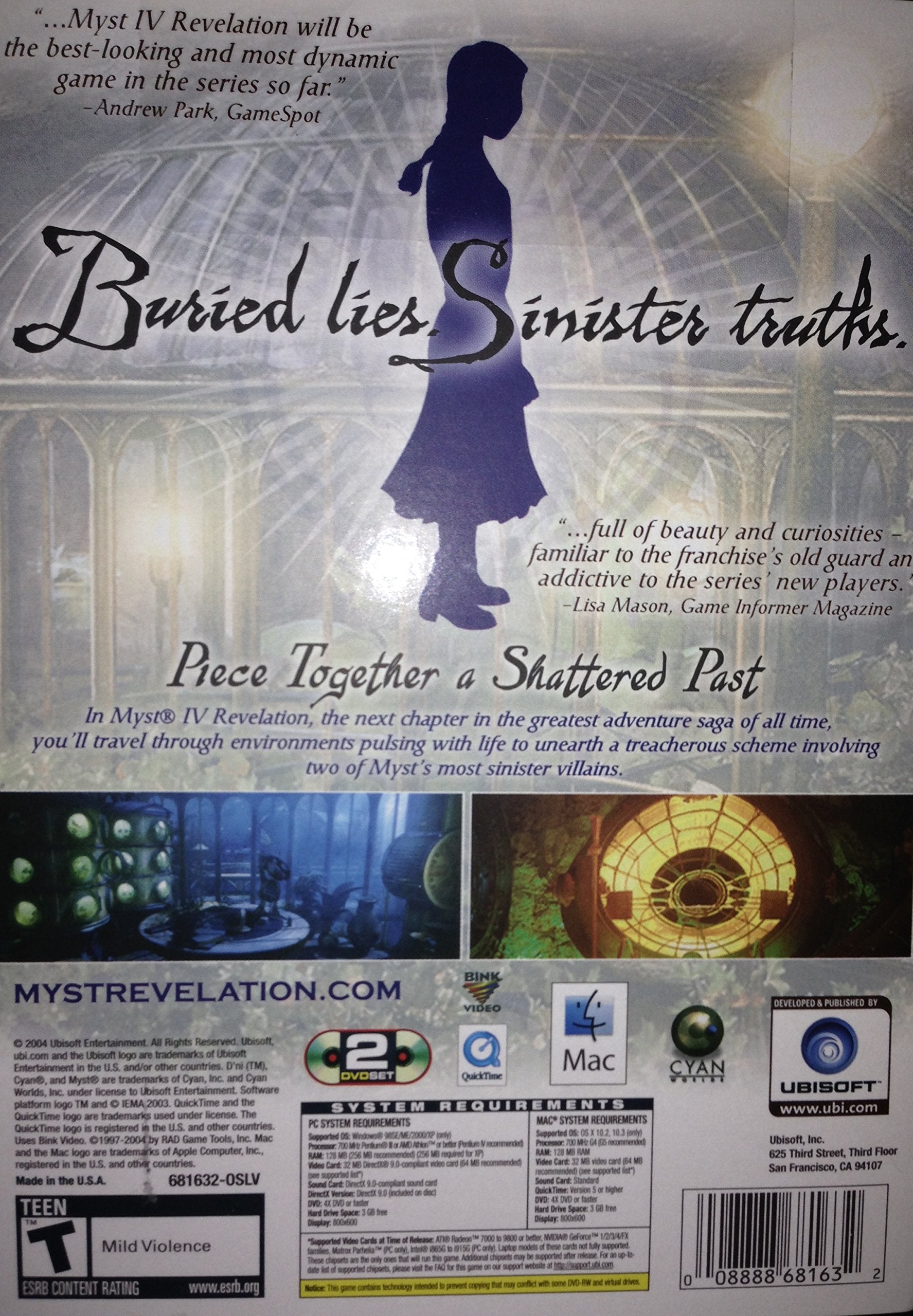 - Q: Is there a specific age group that Myst IV: Revelation is suited for? A: While there is no official age rating provided, Myst IV: Revelation is generally suitable for players who enjoy adventure and puzzle games, typically recommended for ages ten and up.