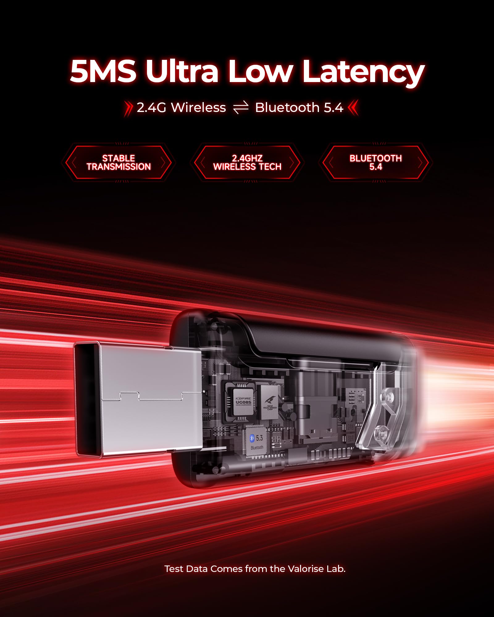 - Q: What is the latency of the wireless connection? A: The Valorise Wireless Gaming Headset offers ultra-low latency of less than five milliseconds when connected via the 2.4GHz dongle, providing a seamless audio experience during gameplay.