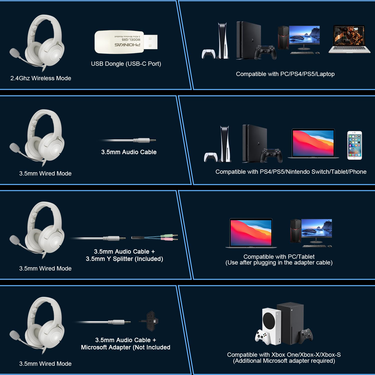 - Q: What platforms are compatible with the YOTMS Wireless Gaming Headsets? A: The YOTMS Wireless Gaming Headsets are compatible with multiple platforms, including PlayStation 4, PlayStation 5, PC, Nintendo Switch, and laptops. They connect via a 2.4 GHz USB dongle, a Type C dual dongle, or a 3.5 mm audio cable.