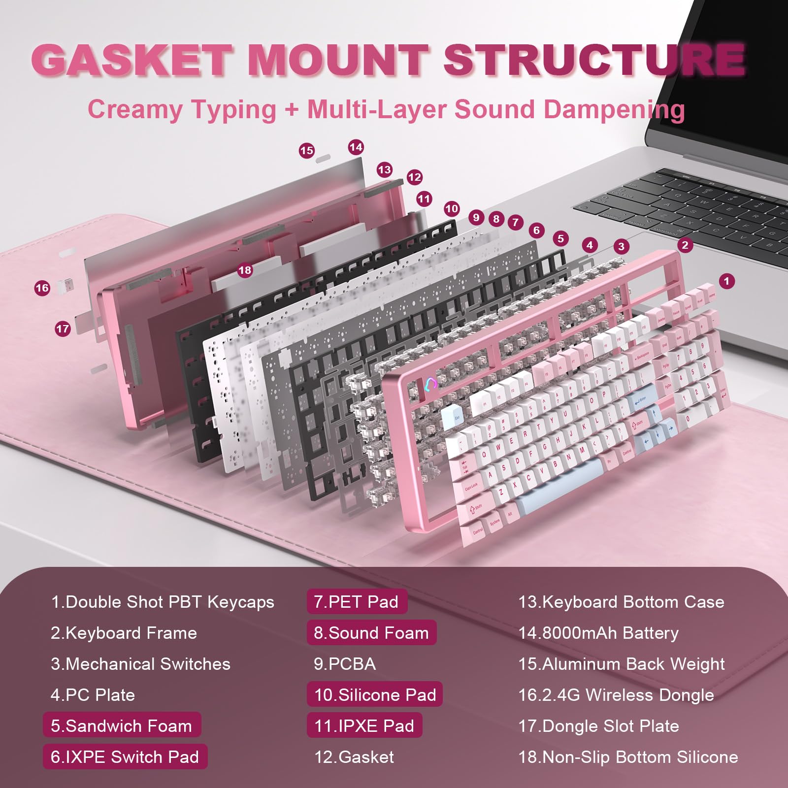 - Q: What is the significance of the gasket-mounted design in the YUNZII AL98? A: The gasket-mounted design in the YUNZII AL98 keyboard contributes to a more comfortable typing experience by providing five layers of cushioning, resulting in a quieter and more satisfying keystroke sound.