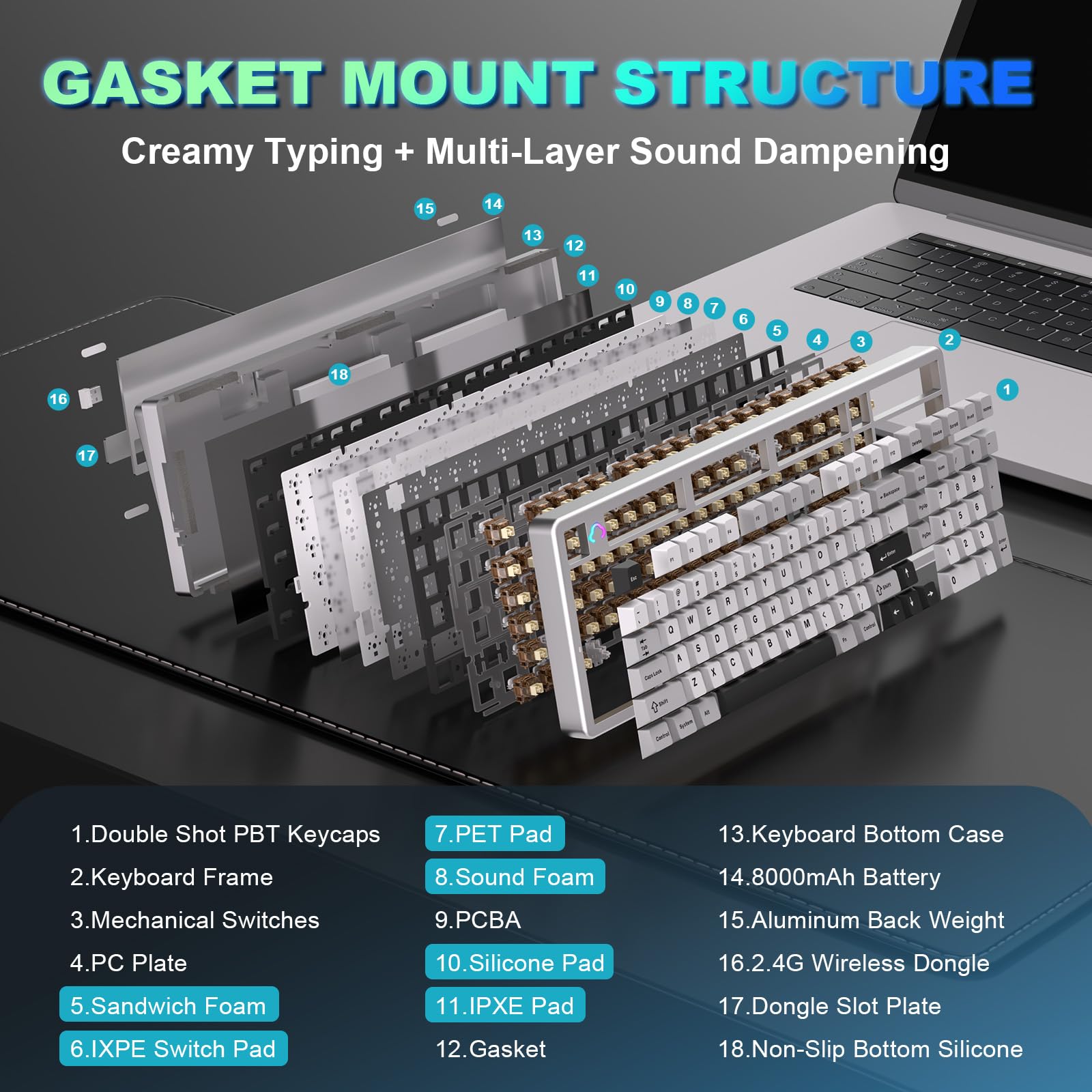 - Q: How does the gasket mount design benefit the keyboard's performance? A: The advanced gasket mount design of the YUNZII AL98 provides enhanced cushioning and stability, resulting in a quieter typing experience and reducing vibrations, which is beneficial for both gaming and office use.