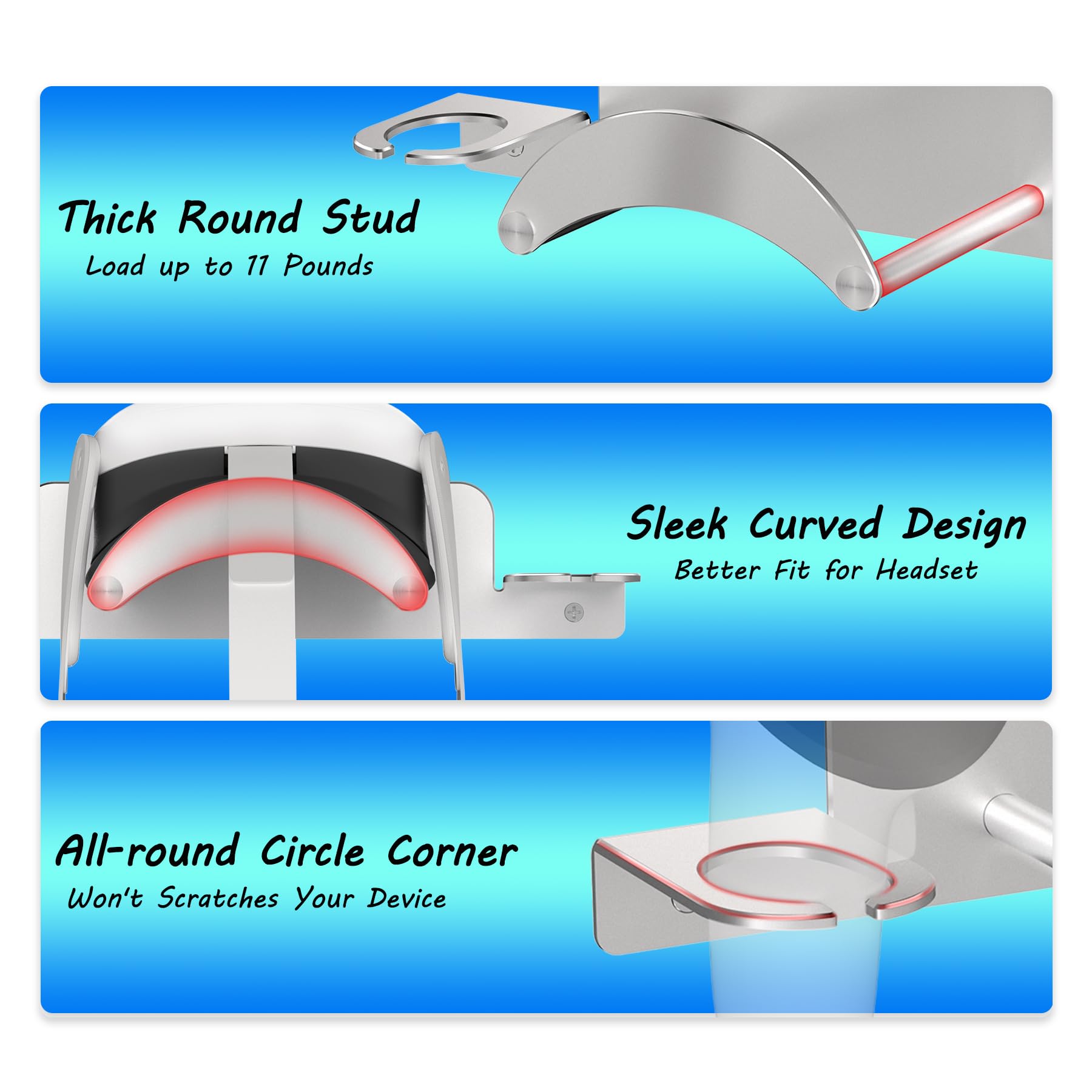 Constructed from high-quality aluminum alloy, the VR wall mount is sturdy and built to last. Its safe and durable design allows it to support up to 11 pounds, ensuring your valuable VR equipment is held securely. The sleek, curved design not only complements the look of your Meta Quest 3, Quest 3S, Oculus Quest 2, Quest Pro, Rift-S, Vision Pro, and other compatible VR devices but also prevents scratches and damage. The mount offers two versatile storage methods, making it adaptable for various headsets and controllers, allowing for optimal organization.